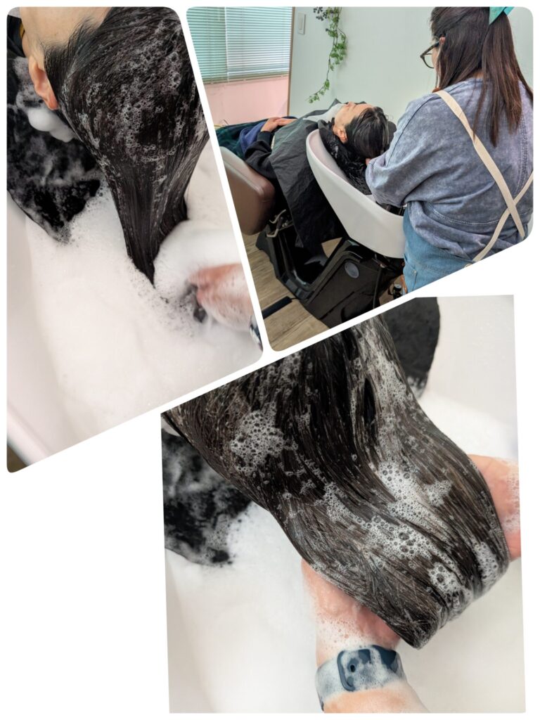 お流しの段階から皮脂やスタイリング剤をふわっと浮かせ、頭皮と髪の素の状態を整えます